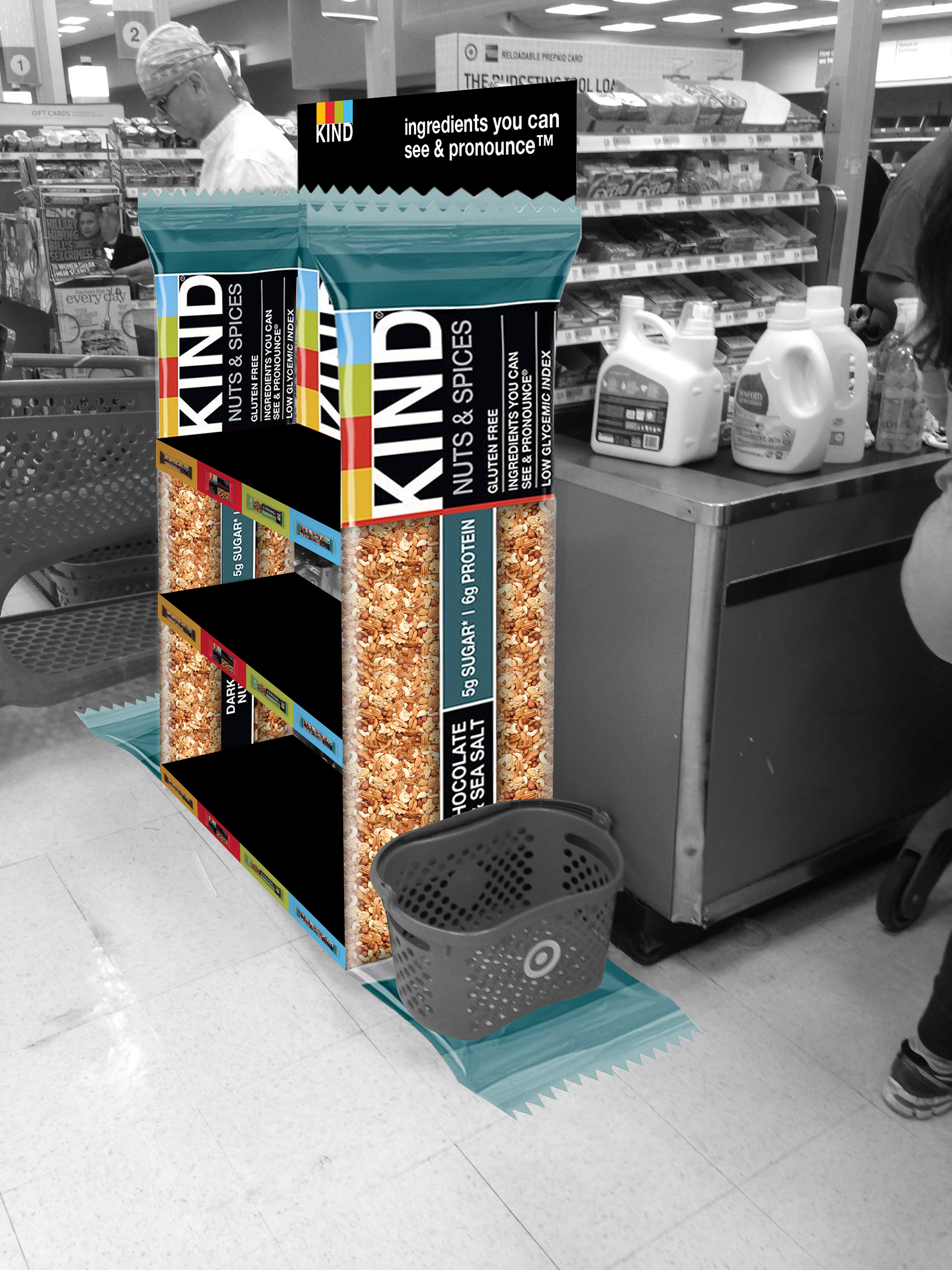Here is a floor decal that covers an “acrylic bridge’ that can be installed on the same aisle as the Kind products. The way this product shows how pure its product is by showing the ingredients makes it possible to show it alongside products that are just as pure - such as water. The copy can change to fit the designated area (e.g. “like water, ingredients so pure you can see it”